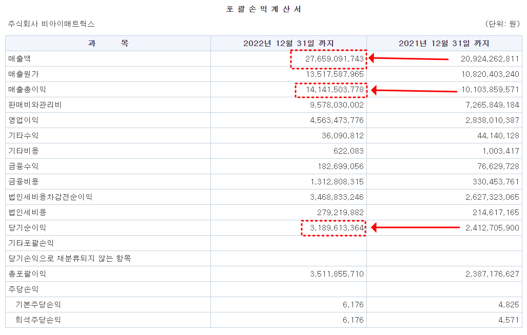 주식회사 비아이매트릭스의 포관 손익계산서를 보고 분석해 봅시다.