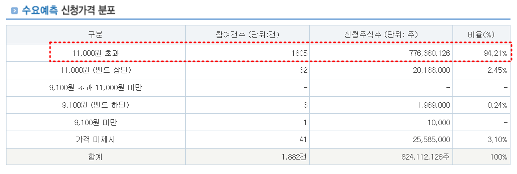 수요예측을 보면 11,000원을 초과하는 비율이 94%가 넘어가면서 엄청난 비율로 상단을 초과했다는 것을 알 수 있습니다.