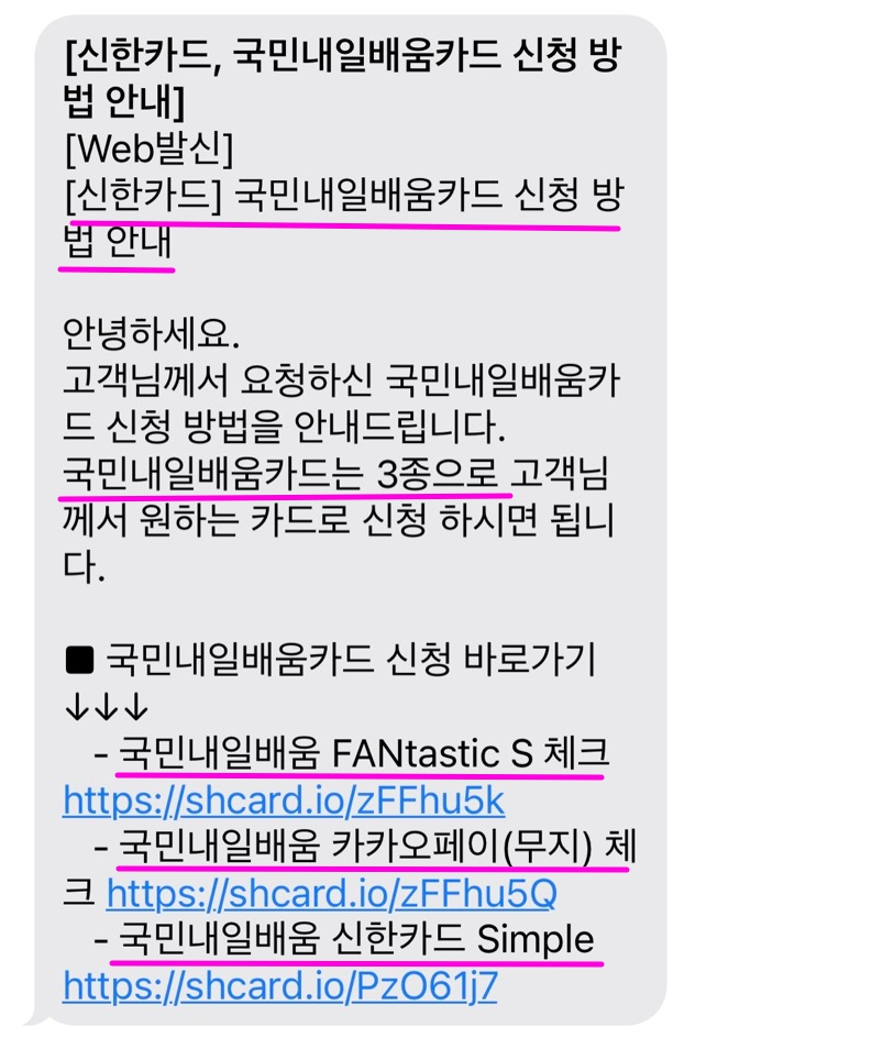 서류가 통과되면 국민내일 배움 카드 여러 개 중 어떤 것으로 발급할 것인지 선택하는 문자가 옵니다.