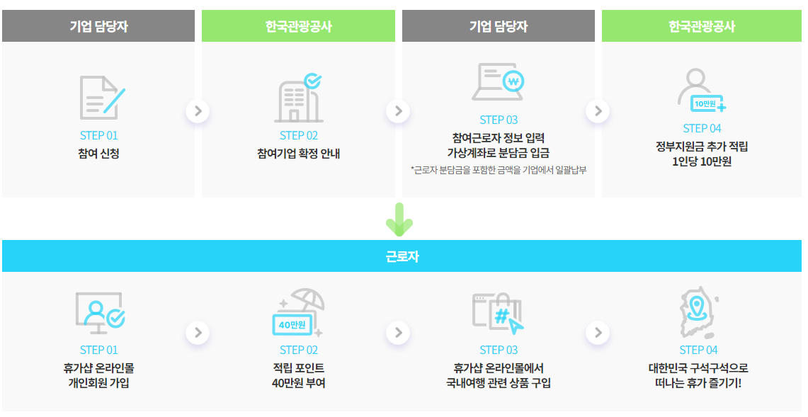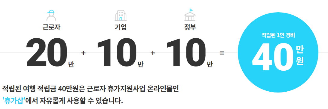 정부지원금은 추가 적립 1인당 10만 원씩 적립되고 근로자들은 휴가샵 온라인몰에 가입하여 적립받은 포인트로 휴가 상품을 구입하면 됩니다.