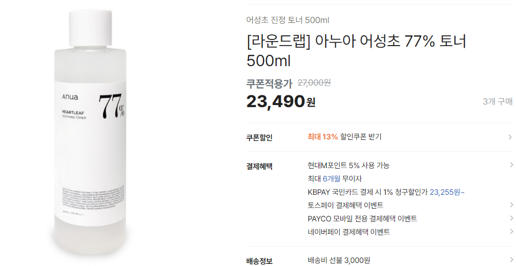 아누아에서 밀고 있는 어성초 제품의 토너로 피지조절에 도움을 많이 주는 제품입니다.